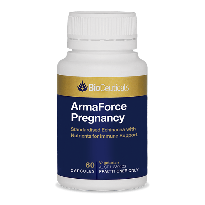 ArmaForce Pregnancy helps to provide gestational immune support with key essential nutrients and standardised echinacea. There is an increased need for vitamin C and zinc during pregnancy, and these nutrients alongside vitamin D and lactoferrin have been shown to help support a healthy immune system. Echinacea is traditionally used in western herbal medicine (WHM) to help relieve the symptoms associated with mild upper respiratory tract infections. This vegetarian formula includes echinacea standardised to 1% cichoric acid.