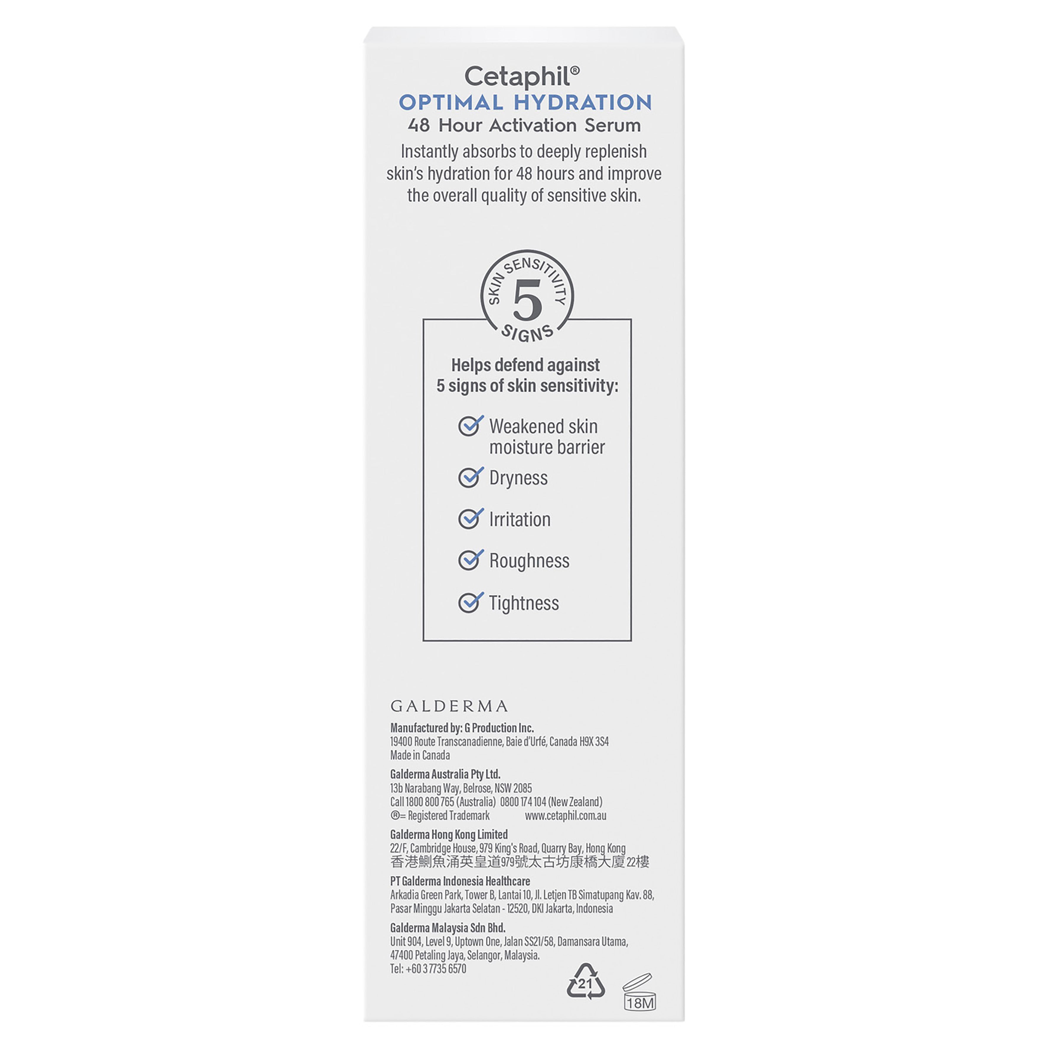 Intensely hydrating, Cetaphil Optimal Hydration 48 Hour Activation Serum is specially developed to improve the overall quality and resilience of sensitive skin. This lightweight serum contains the innovative HydroSensitiv™ Complex that soothes your skin and deepens dynamic hydration, as well as Hyaluronic Acid, Sunflower Seed Oil, Shea Oil, Pro-Vitamin B5 and Vitamin E to rehydrate and restore the appearance of your skin. Ideal for morning and evening use on your face and neck, alone or layered.