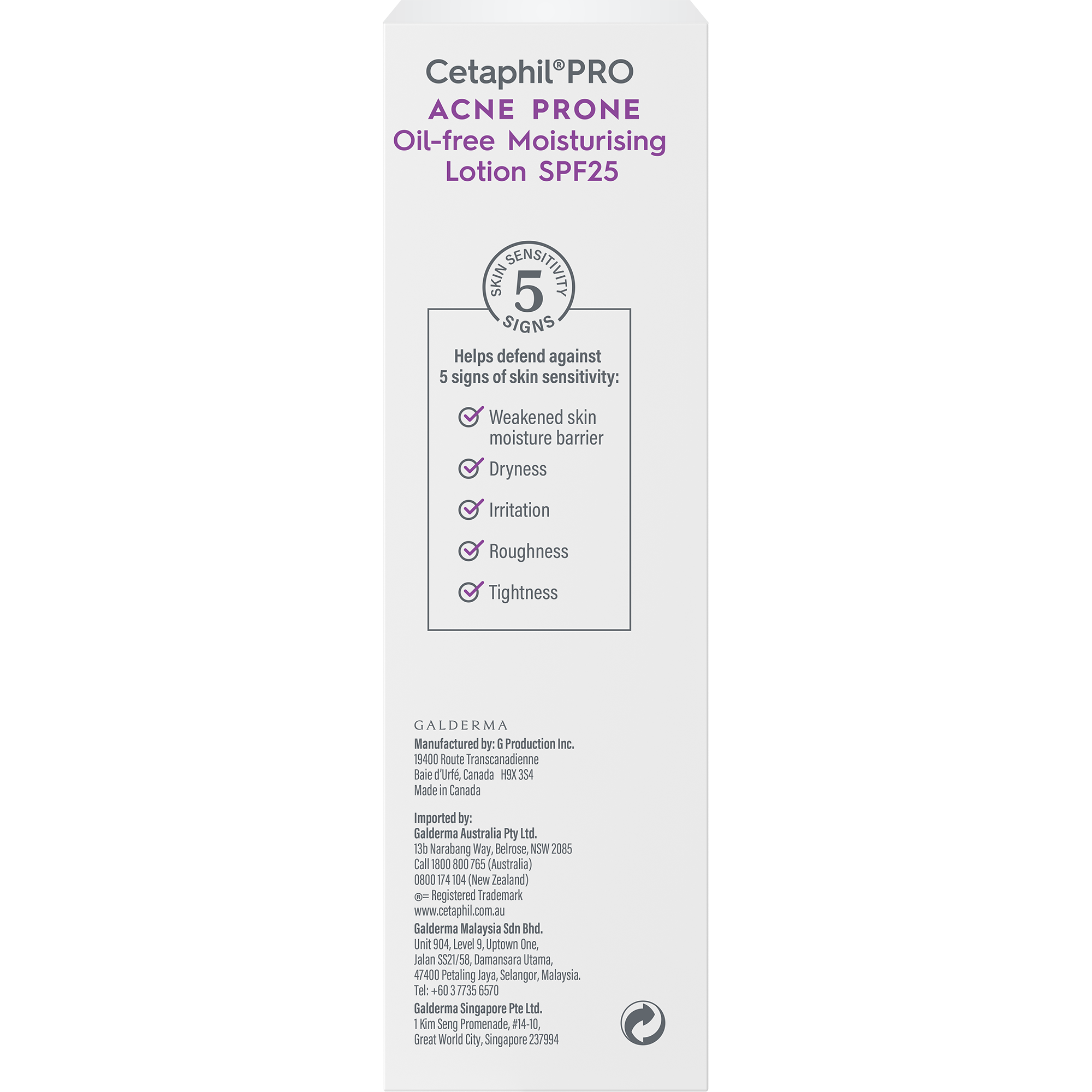 Cetaphil Pro Acne Prone Oil-Free Moisturising Lotion with SPF25 is specially developed for oily, sensitive and acne-prone skin. Featuring a combination of soothing Ceramide and Zinc Technology, this non-comedogenic moisturising lotion effectively controls excess oil, hydrates and replenishes your skin’s moisture barrier without clogging your pores. Plus, its hypoallergenic formula is also free of fragrance, parabens and animal-origin ingredients.