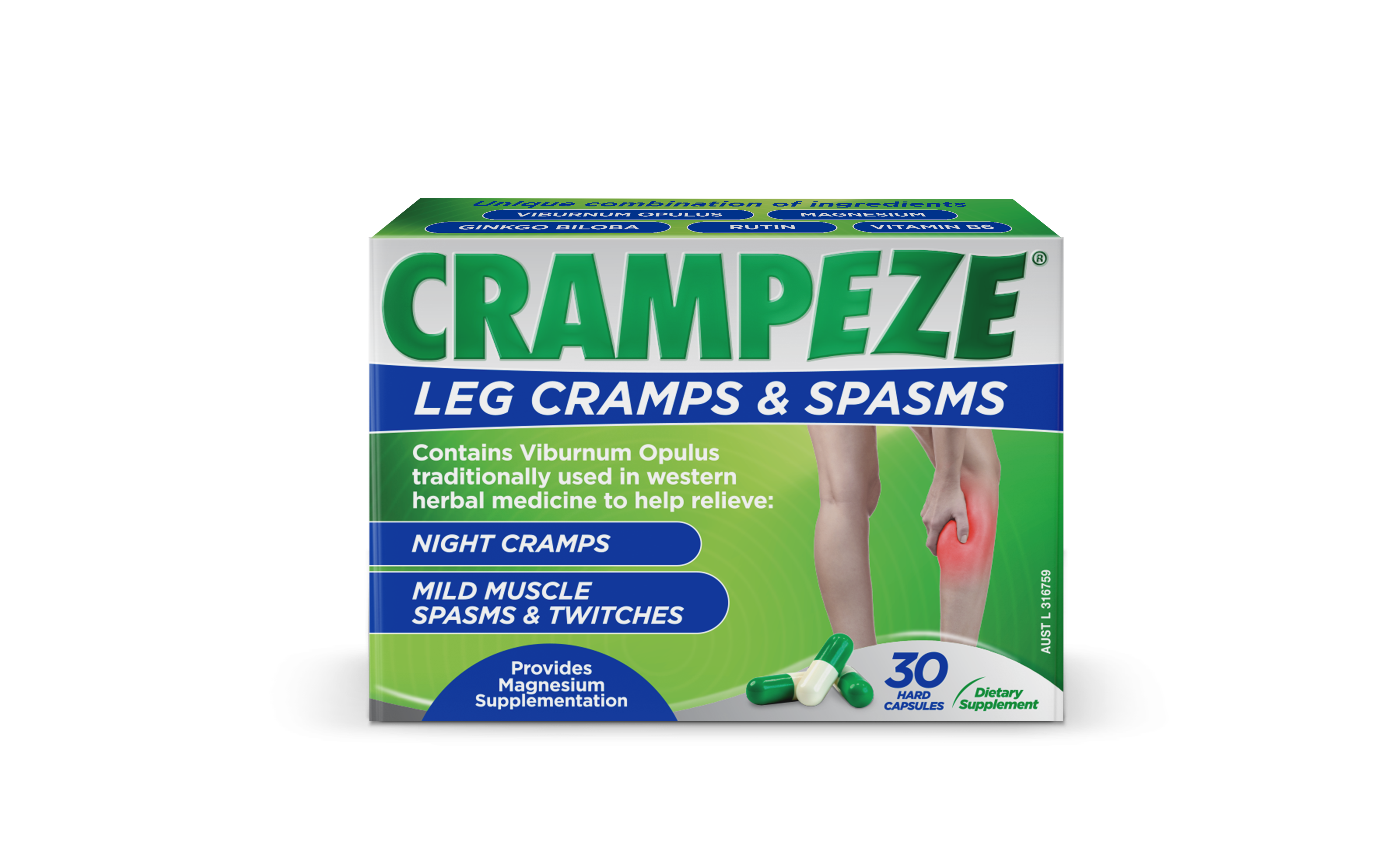 Crampeze Leg Cramps & Spasms contains Viburnum Opulus, an antispasmodic (Cramp Bark) traditionally used in western herbal medicine to help relieve night cramps and mild muscle spasms & twitches.