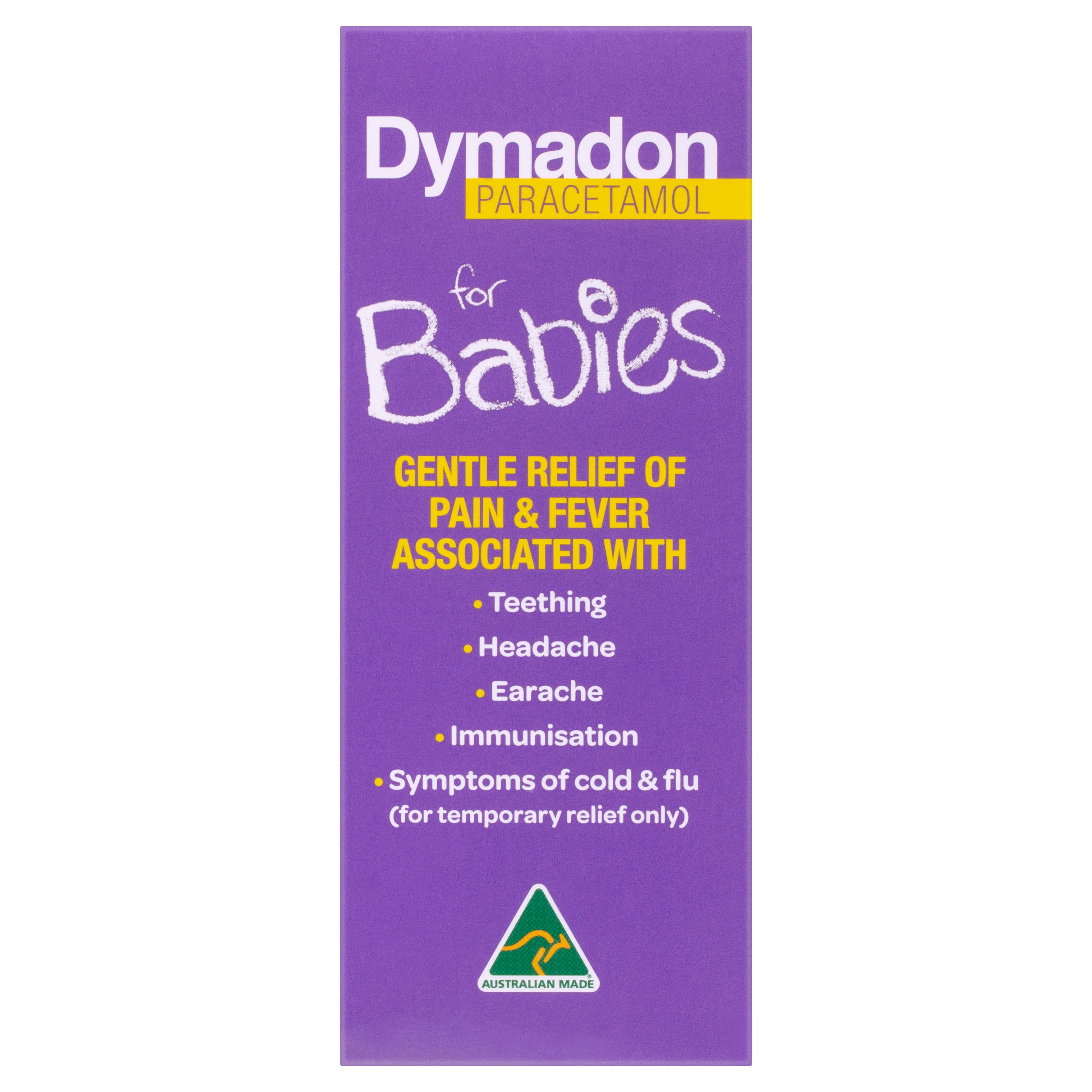 Dymadon for Babies can be used to provide temporary relief of pain and fever associated with headache, earache, toothache, immunisations and symptoms of cold and flu.