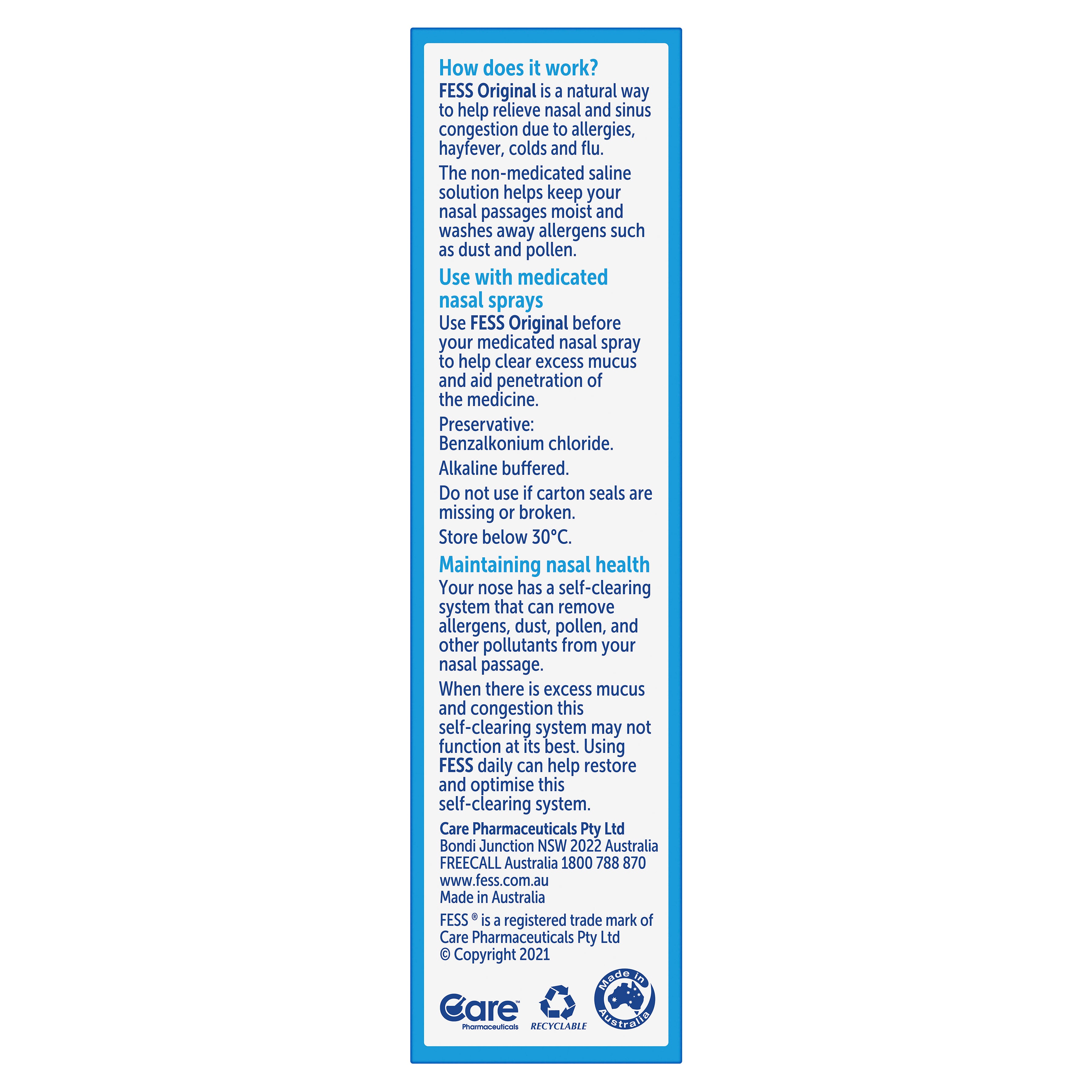 FESS Original Nasal Saline Spray is a natural way to help relieve nasal and sinus congestion due to allergies, hayfever,cold and flu.