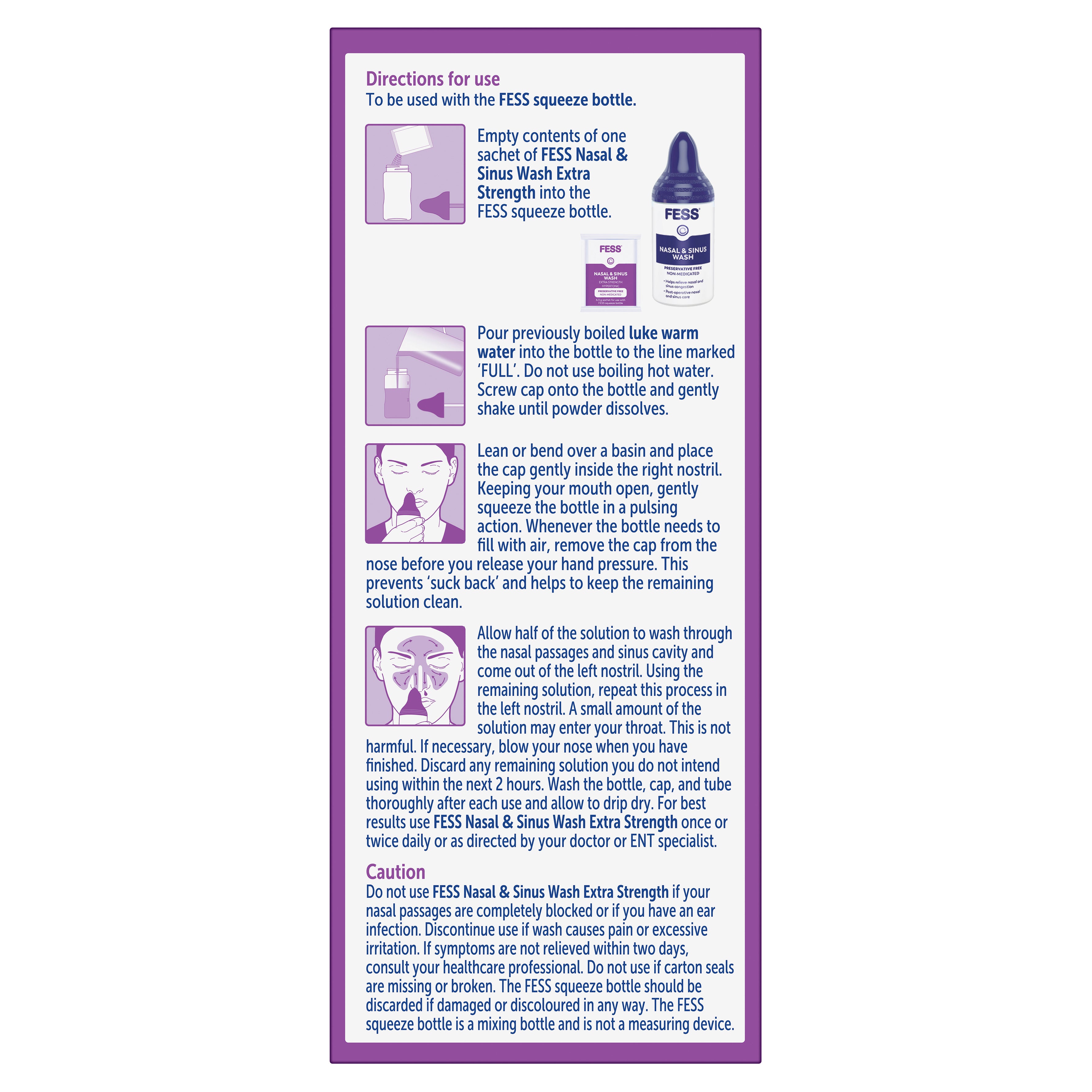 FESS Nasal & Sinus Wash Extra Strength Saline Wash Kit is a natural way to help relieve nasal and sinus congestion. Irrigating the nasal and sinus cavities with large volume of saline solution helps wash away excess musis and relieves nasal and sinus congestion due to: