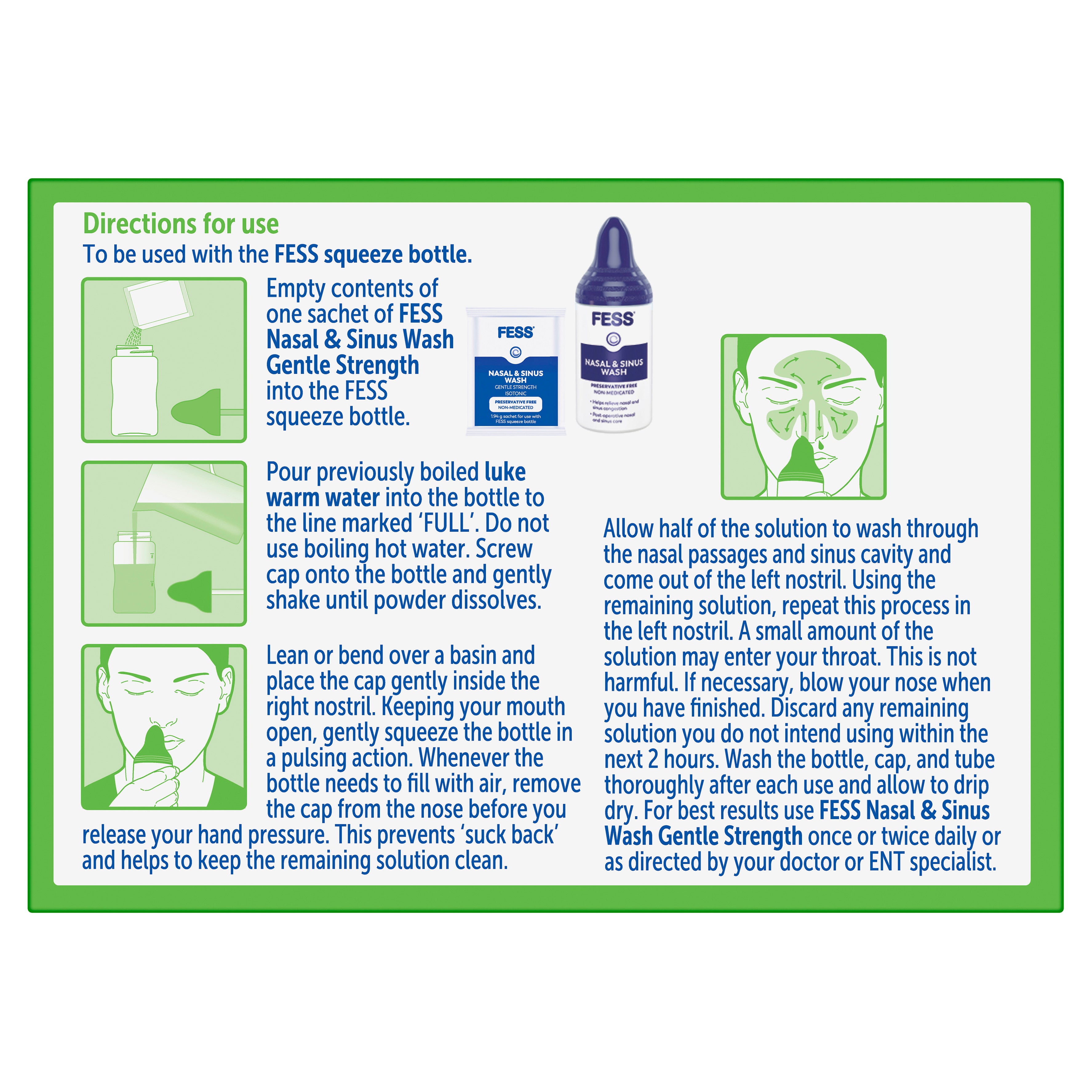 FESS Nasal & Sinus Wash Gentle Strength is a natural way gto help relieve nasal and sinus congestion. Irrigating the nasal and sinus cavities with large volume of saline solution helps wash away excess mucus and relieves nasal and sinus congestion due to: