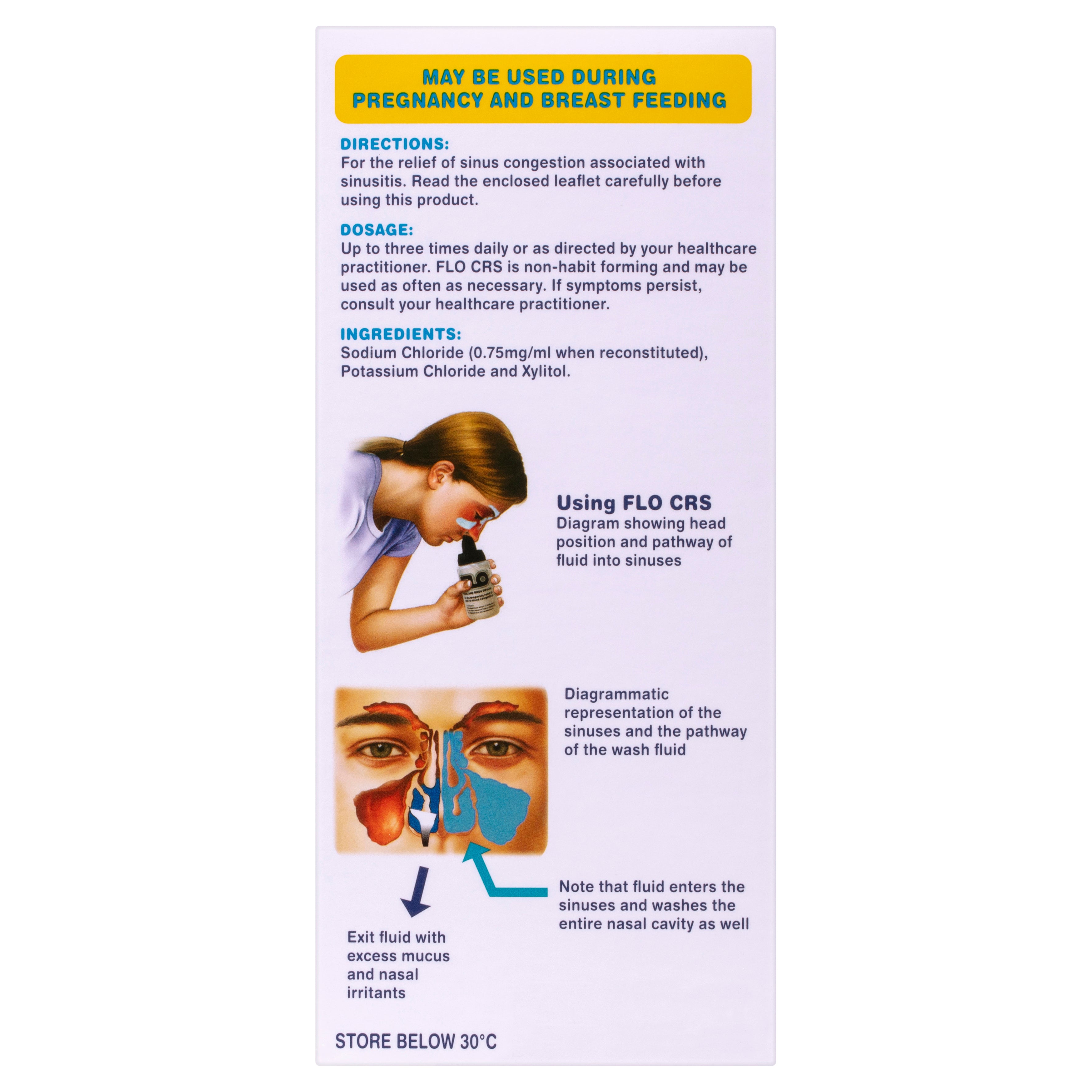 FLO CRS is a large volume nasal and sinus wash that has been specifically formulated for patients suffering from sinusitis. FLO CRS is a large-volume, non-medicated, preservative-free, isotonic irrigation solution for severe sinus congestion. It helps to clear the nose and sinus cavities by washing away mucus and inflammatory matter in a natural way.