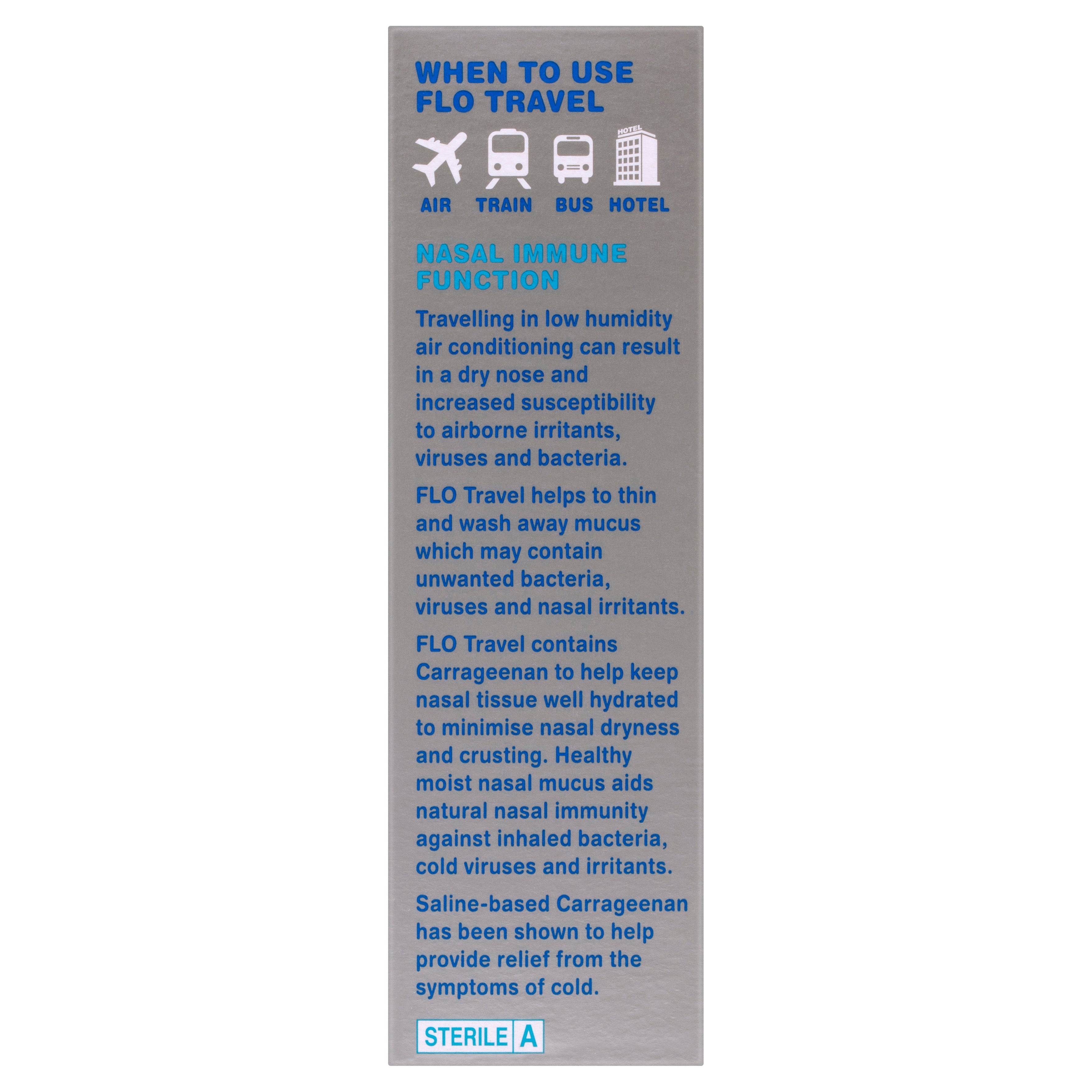 FLO Travel is a preservative free, isotonic saline nasal spray containing Carrageenan (red seaweed extract). FLO Travel helps to keep nasal tissue hydrated which aids in natural nasal immunity and increase the rate of recovery from colds due to Coronaviruses, Rhinoviruses and Influenza viruses.