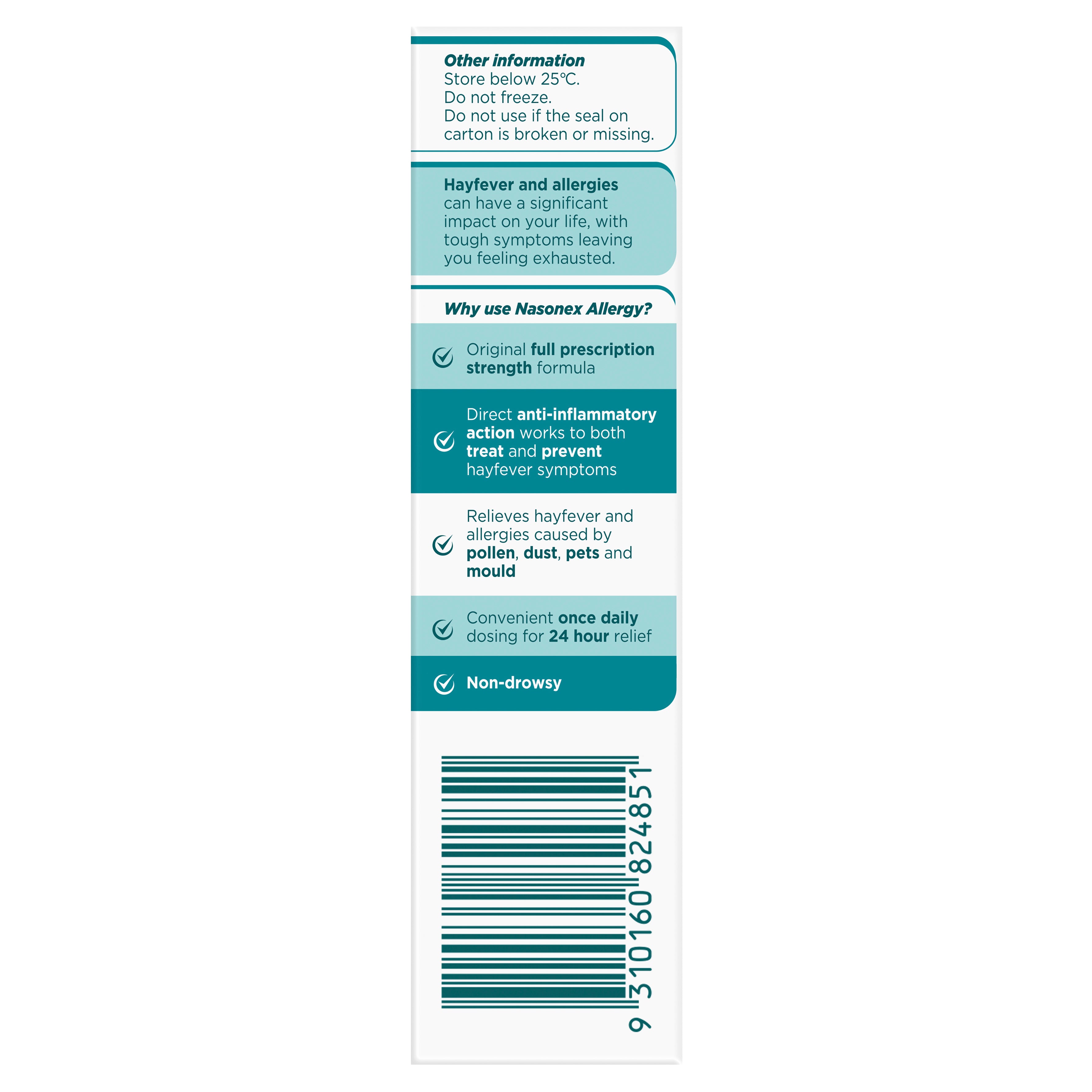 Nasonex Allergy provides direct anti-inflammatory action that works inside the nasal passages to both relieve and prevent tough hayfever symptoms. Nasonex Allergy provides non-drowsy relief of hayfever and other airborne allergy symptoms such as: