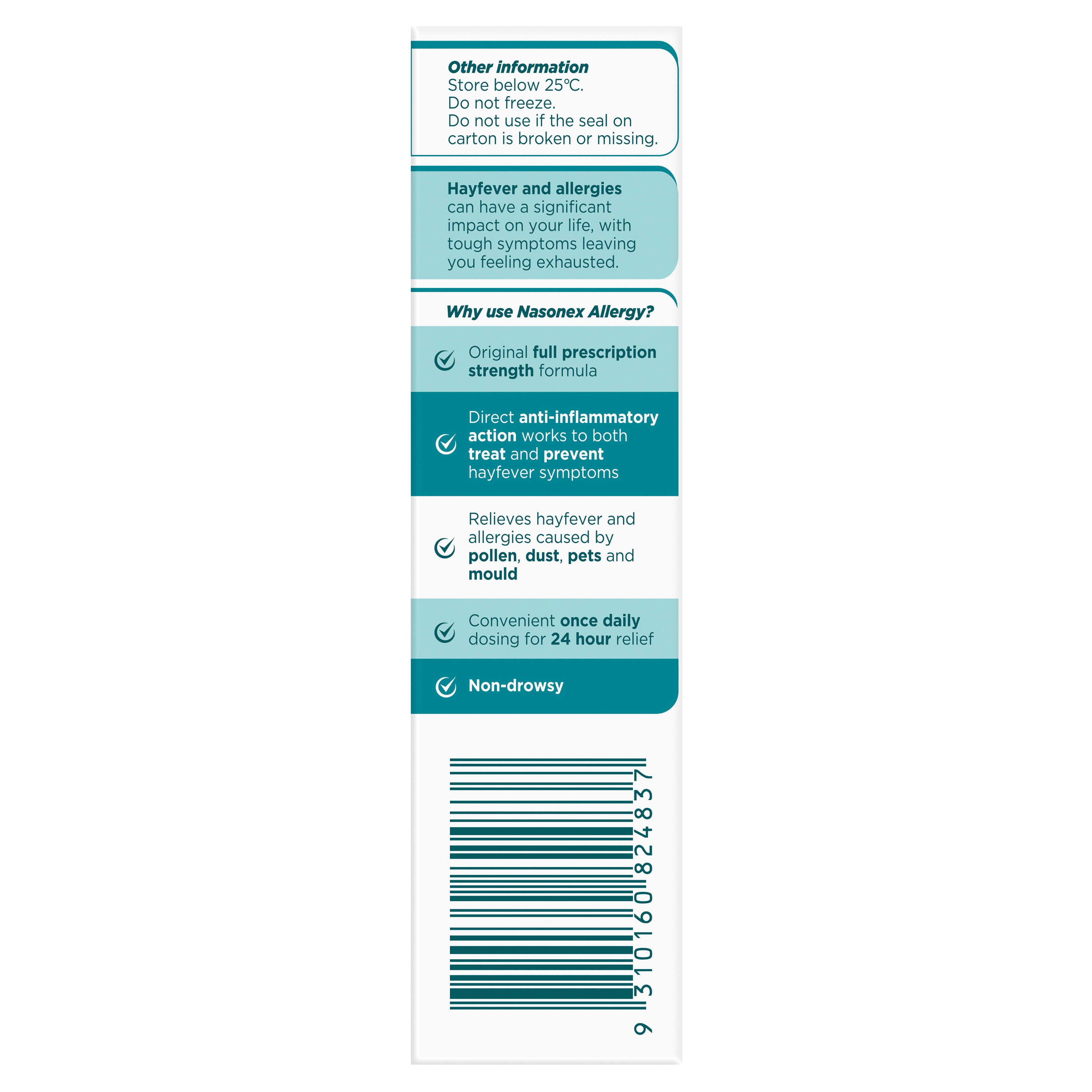 Nasonex Allergy provides direct anti-inflammatory action that works inside the nasal passages to both relieve and prevent tough hayfever symptoms. Nasonex Allergy provides non-drowsy relief of hayfever and other airborne allergy symptoms such as: