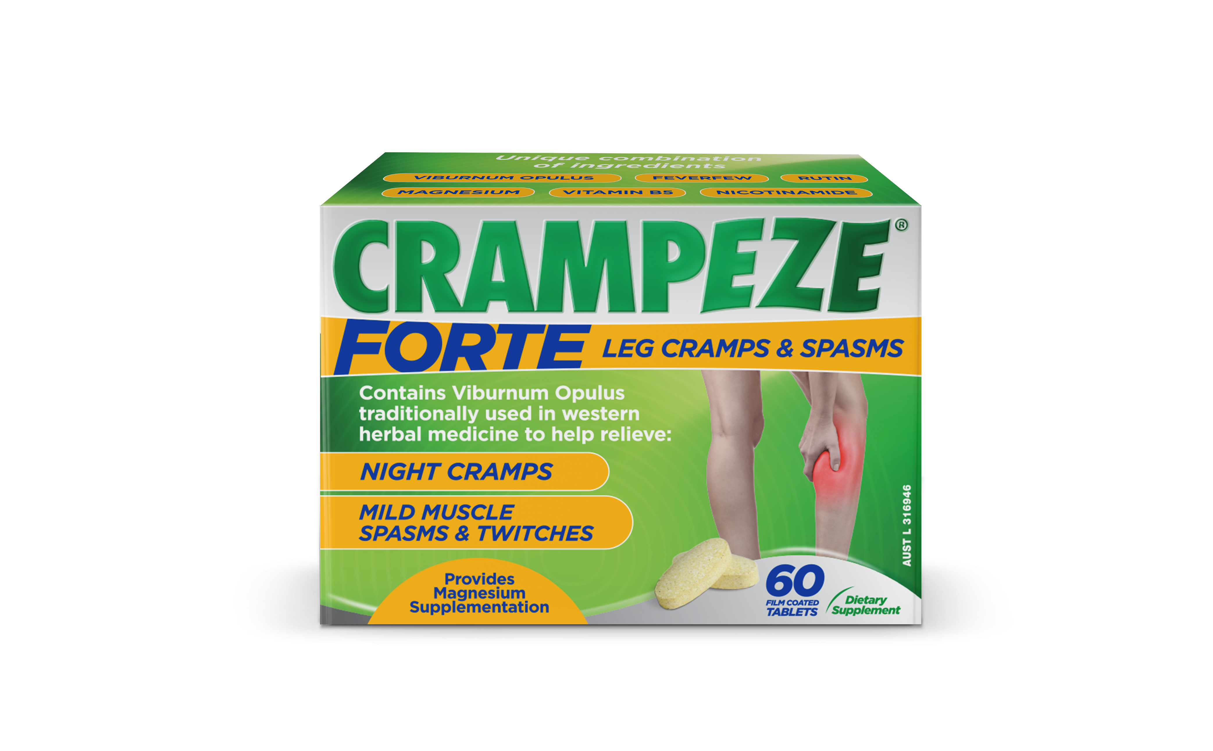Crampeze Forte Leg Cramps & Spasms contains Viburnum Opulus, an antispasmodic (Cramp Bark) traditionally used in western herbal medicine to help relieve night cramps and mild muscle spasms & twitches. It also contains nicotinamide, feverfew extract and vitamin B5.