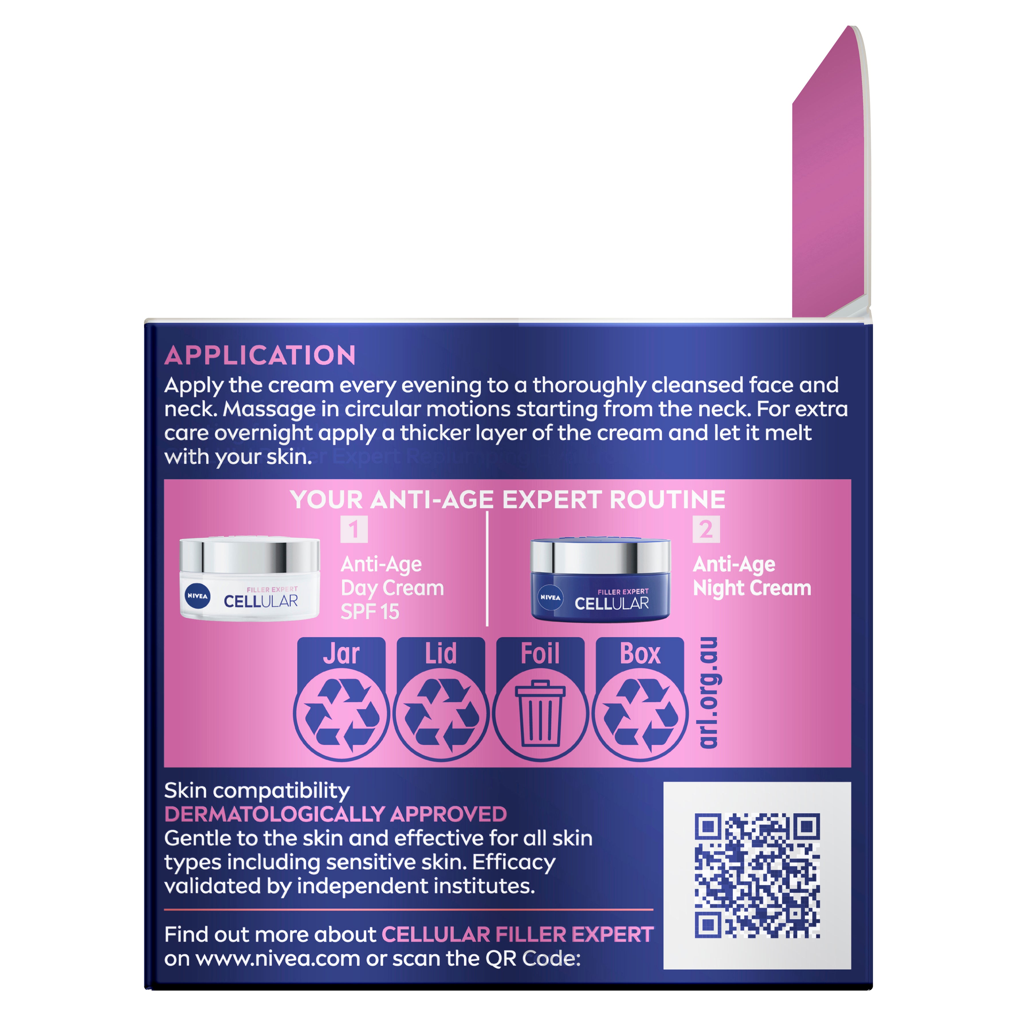 NIVEA Cellular Filler Expert Anti-Age Night Cream with its innovative formula features a combination of powerful anti-age actives providing visible filler effect in 1 week and fighting loss of firmness and volume to reveal younger looking skin. Made with Hyaluronic Acid and Folic Acid, the night cream works to firm, fill wrinkles and visibly restore volume to the skin. This night cream works whilst you are sleeping, when your skin is at its most receptive, to support your skin's natural renewal process giving your skin a fresh and well rested appearance. The skin compatibility of this night cream has been dermatologically approved.