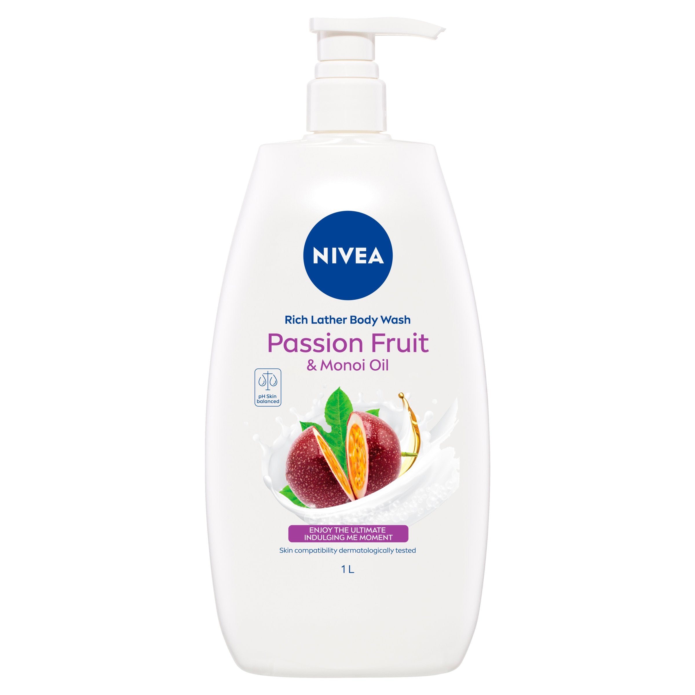 NIVEA Rich Lather Passion Fruit & Monoi Oil Body Wash transforms to a soft lather, leaving your skin feeling silky and moisturised. Let this caring body wash with monoi oil nourish your skin with a rich lather, while its mild passion fruit scent delights your senses. The body wash leaves skin feeling soft and moisturised, even after towel drying. Skin compatibility dermatologically approved. NIVEA Rich Lather Passion Fruit & Monoi Oil Body Wash is pH skin-balanced so it is suitable for all skin types for everyday usage. Enjoy the ultimate indulging me-moment, every day - simply apply to your wet skin and massage it onto your whole body before rinsing it off. The formula is readily biodegradable so it’s also good for the environment!