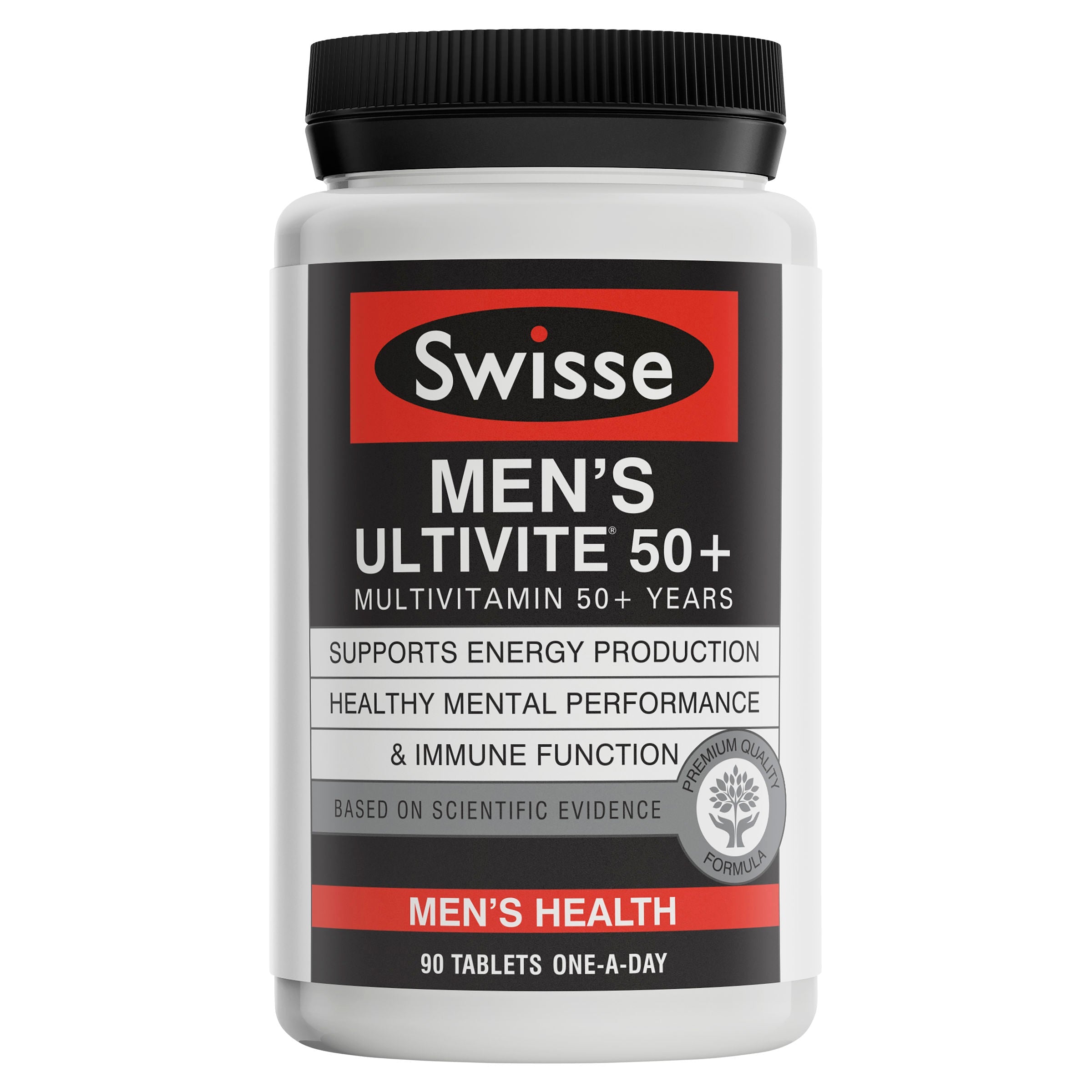 Swisse Ultivite Men's 50+ Multivitamin is a premium quality formula containing 41 vitamins, minerals, antioxidants and herbs to support a healthy, active lifestyle. Tailored for men 50 years and over, this comprehensive multivitamin supports energy production, stamina, cognitive function and healthy immune function.