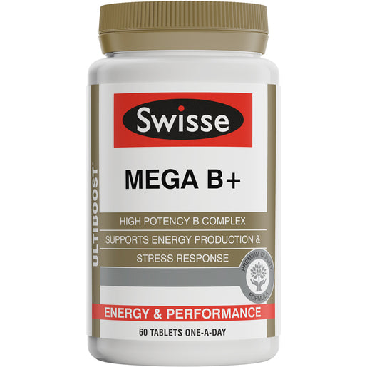 Swisse Ultiboost Mega B+ is a comprehensive formula containing high potency B vitamins, minerals, lemon balm, vitamin E and C. B vitamins help the body metabolise food into energy and provide increased nutritional support during periods of nervous tension and stress. When lifestyles include processed foods, alcohol, sugar, caffeine and stress, B vitamin levels in the body may be depleted.