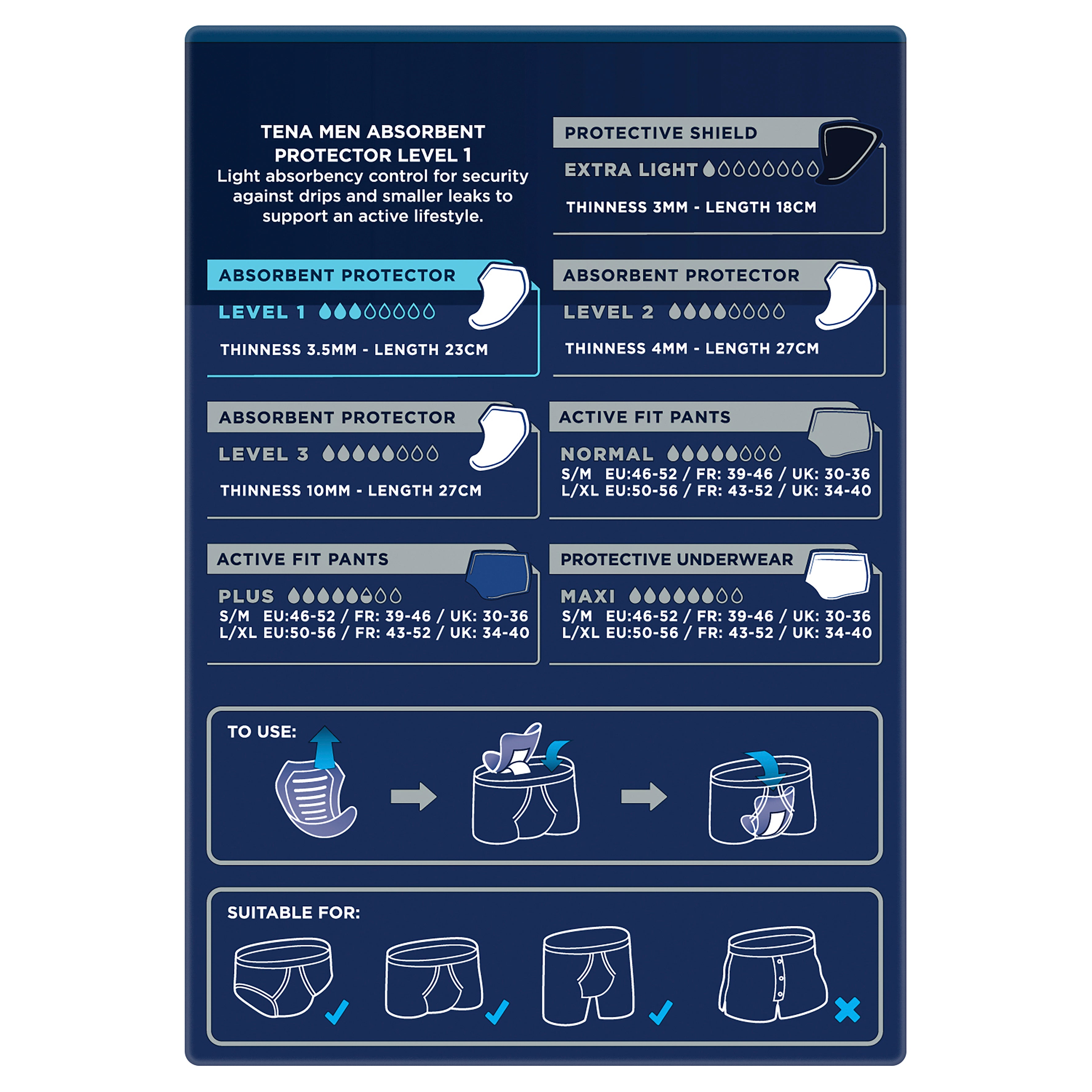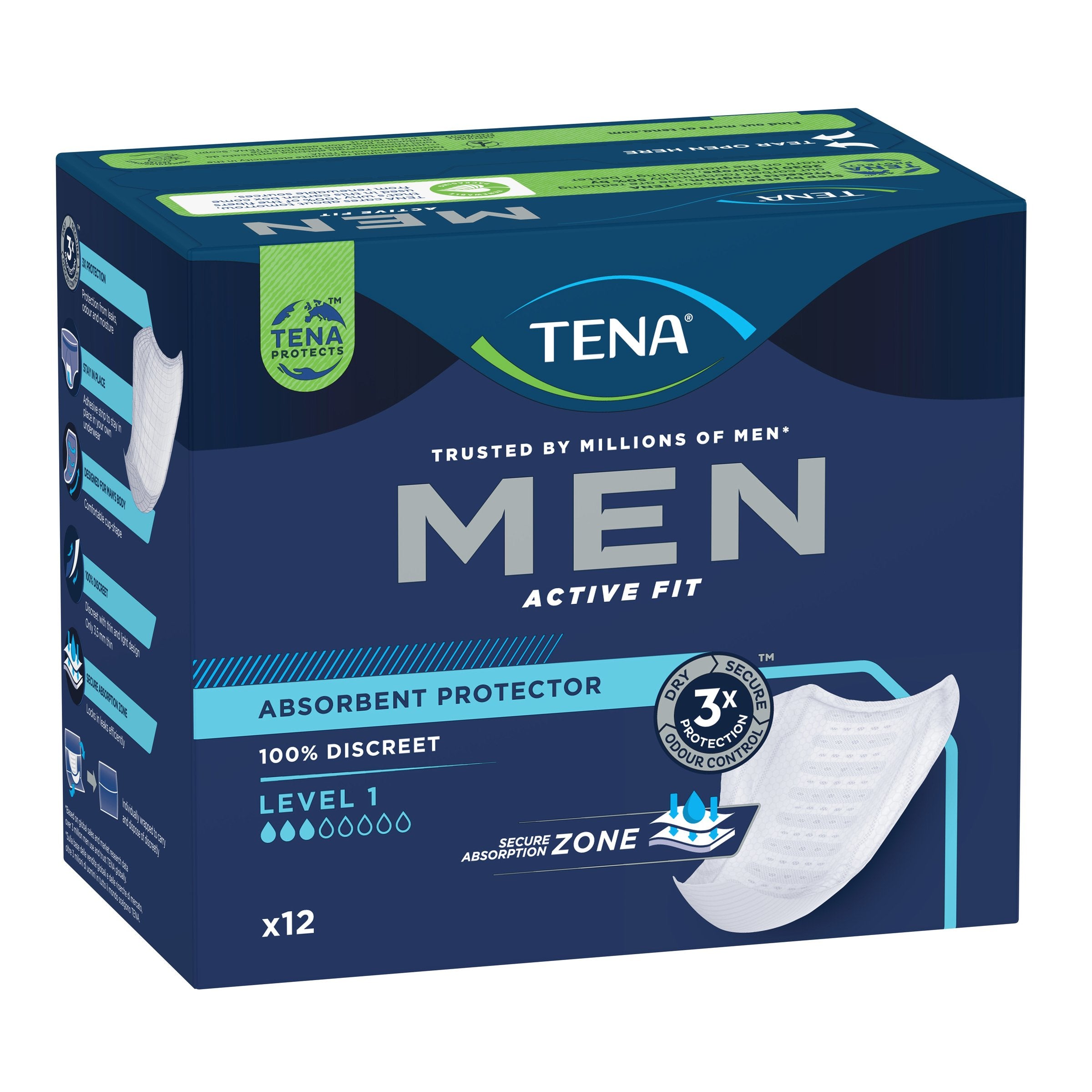 TENA Men Active Fit Absorbent Protector Level 1 absorbs light bladder leaks and protects against odour and moisture.