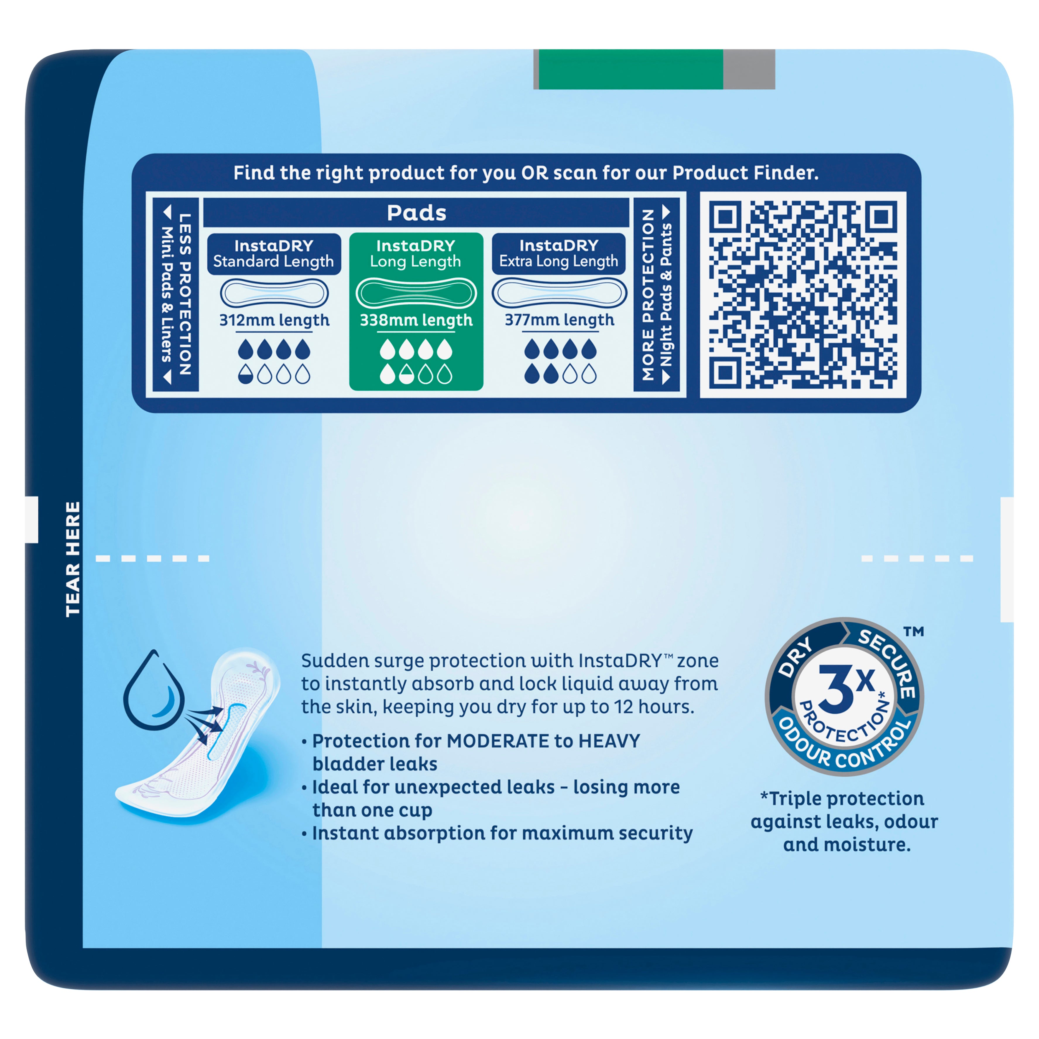 TENA Pads InstaDRY™ Long Length is the ultimate everyday choice for any women with medium to heavy bladder weakness, for those urine leaks that can be so unpredictable. Feel secure whatever comes your way with instant absorption and comfortable fit.
