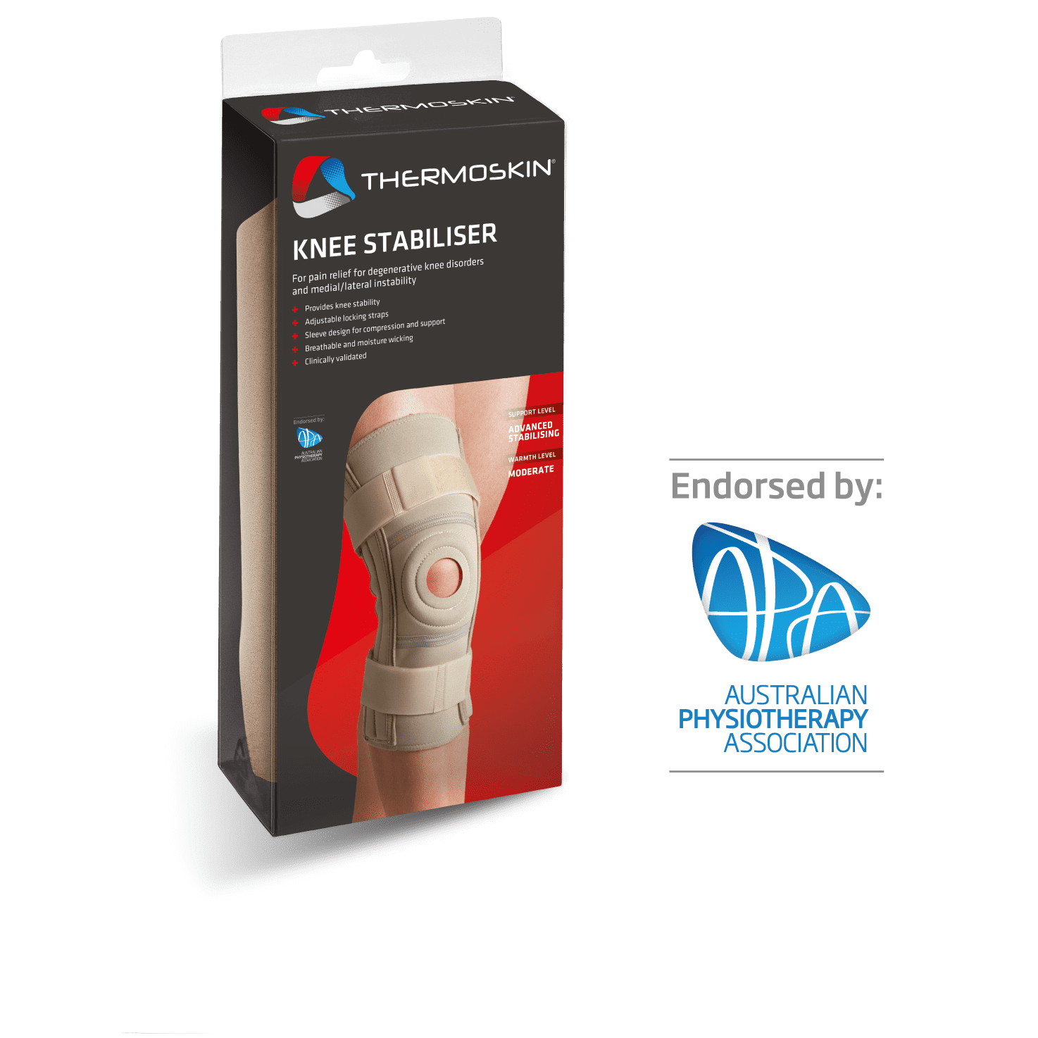 The Thermoskin Knee Stabiliser may be suitable for a range of injuries such as medial and lateral instability and pain due to degenerative disease. The brace is designed with internal metal stays to moderately stabilise the knee and fastener locking straps to further enhance stability.